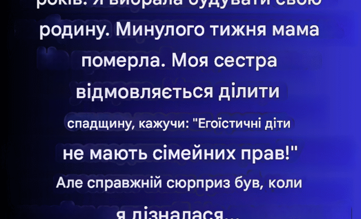 Здрастуйте, мене звуть Венді. Мені 35 років, я мама двох восьмирічних синів-близнюків. Моя старша сестра, Синтія, якій 37 років, присвятила майже десять років догляду за нашою хворою матір’ю. Я ж зосередилася на вихованні сім’ї. Минулого тижня наша мама померла. З того часу Синтія відмовляється ділитися спадщиною, звинувачуючи мене в тому, що я “егоїстична дитина, яка відмовилася від своїх сімейних прав”. Справжнім шоком стало те, що перед смертю наша мати юридично передала всі свої активи Синтії. Це близько 85 000 доларів заощаджень, земельна ділянка та, що найболючіше, наш сімейний будинок.