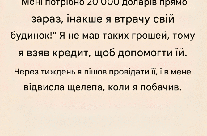 Тієї ночі мама сказала, що їй потрібно 20 000 доларів — негайно — інакше вона втратить будинок. Я не мав таких грошей, але це не мало значення. Я пішла до банку та взяла кредит. Допомогти їй здавалося єдиним варіантом. Не було жодних сумнівів. То була моя мати. Але те, що сталося далі, приголомшило мене. Коли я прийшла до неї за кілька днів, я очікувала побачити ознаки того, що жінка намагається втриматися на плаву. Натомість я увійшла до свіжовідремонтованого будинку – нових меблів, величезного телевізора з плоским екраном і простору, який більше був схожий на виставкову залу, ніж на місце, що знаходиться під загрозою втрати права викупу. Я спитала її, збентежена і вбита горем: «Хіба ти не казала, що ось-ось втратиш будинок?» Вона відмахнулася і сказала: Ти молода — ти заробиш їх назад. Я просто хотіла хоч раз відчути себе щасливою».