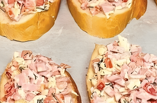 На батон викладаємо начинку і запікаємо 8-10 хвилин при температурі 180 градусів.
