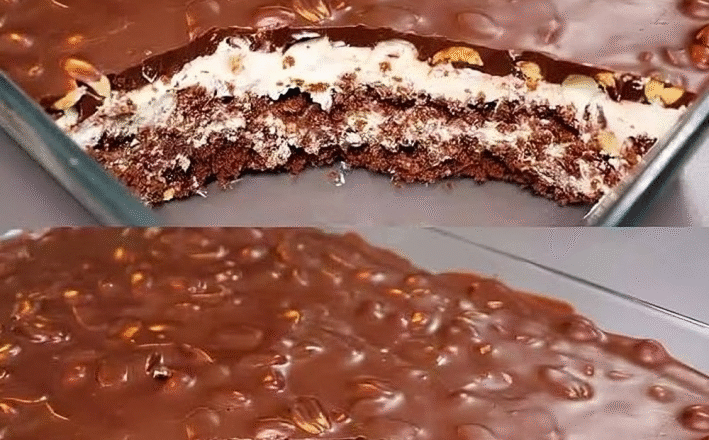 До шоколаду вливаю олію, розтоплюю або на водяній бані, або в мікрохвильовій печі. Перемішую, висипаю обсмажений арахіс. Глазур охолоджую і виливаю поверх крему, ставлю торт у холодильник на 2 години. Цей торт неймовірно смачний!
