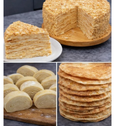 У кільце або форму викладаємо коржі, щедро змащуючи кожен кремом. Два коржі подрібнюємо в крихту та посипаємо боки й верх торта. Залишаємо торт при кімнатній температурі на 2–3 години, потім охолоджуємо в холодильнику 6 годин.