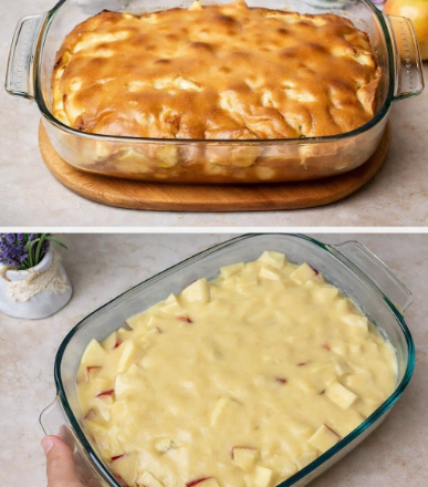 - Форму для випікання змастіть вершковим маслом, викладіть яблука рівним шаром і залийте тістом.